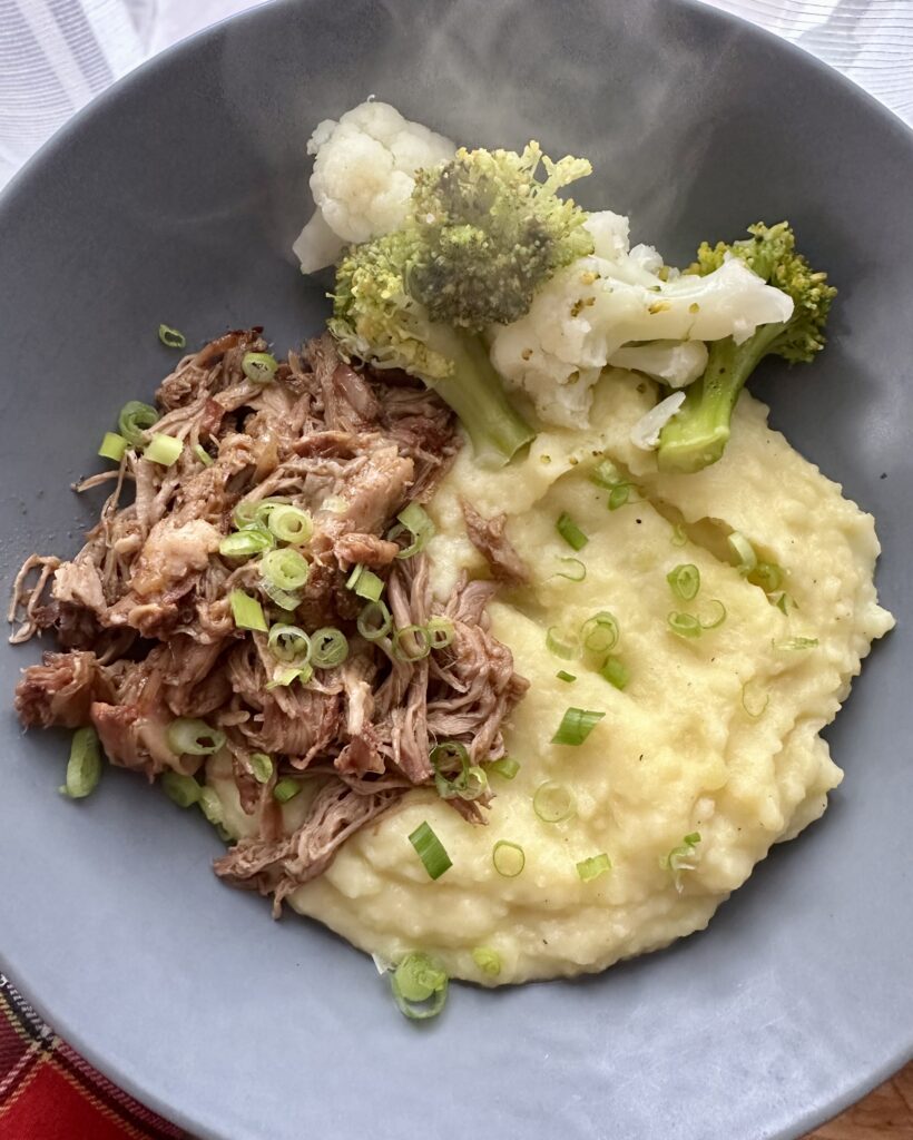 - Pulled Pork with Mashed Potatoes and Buttered Cauliflower and Broccoli
